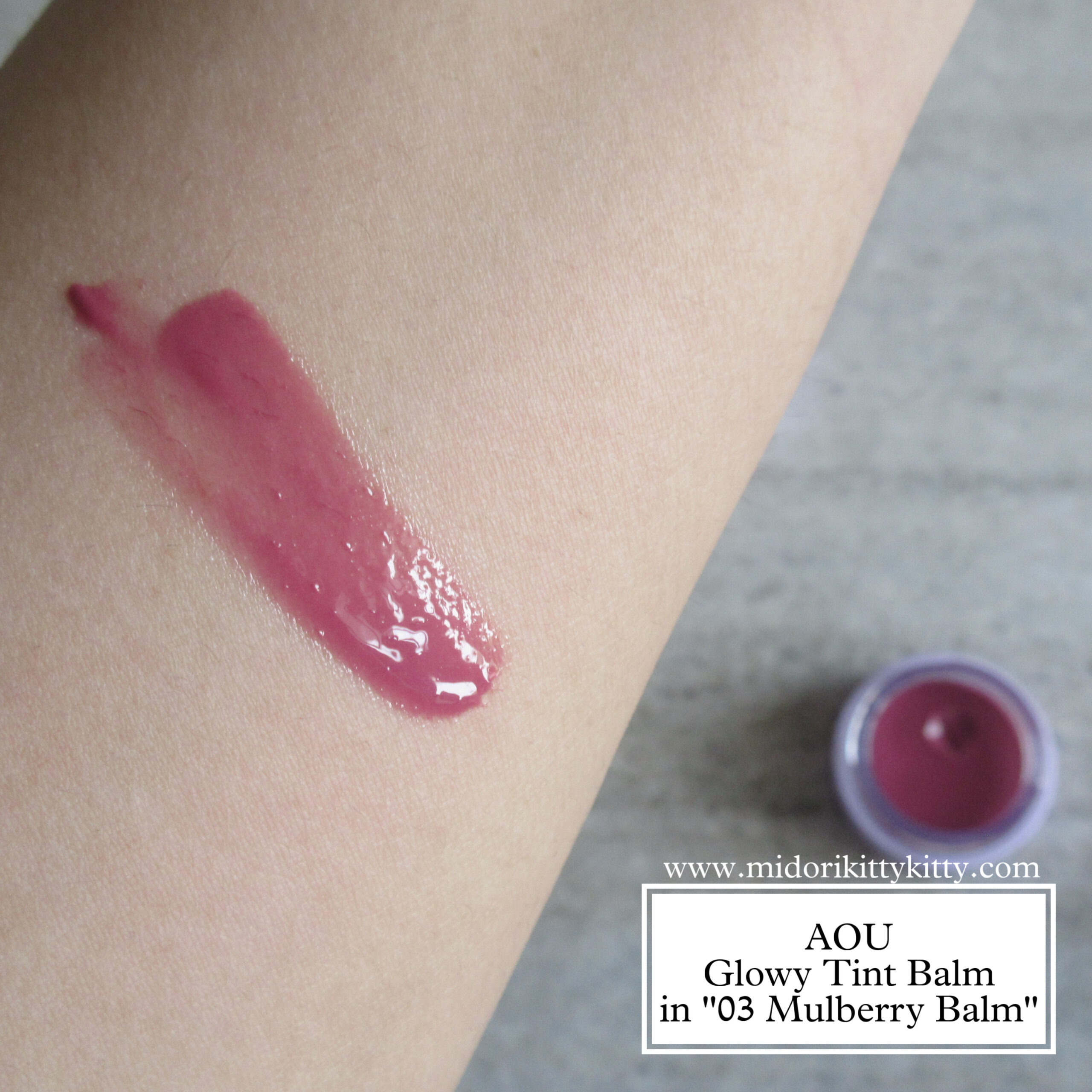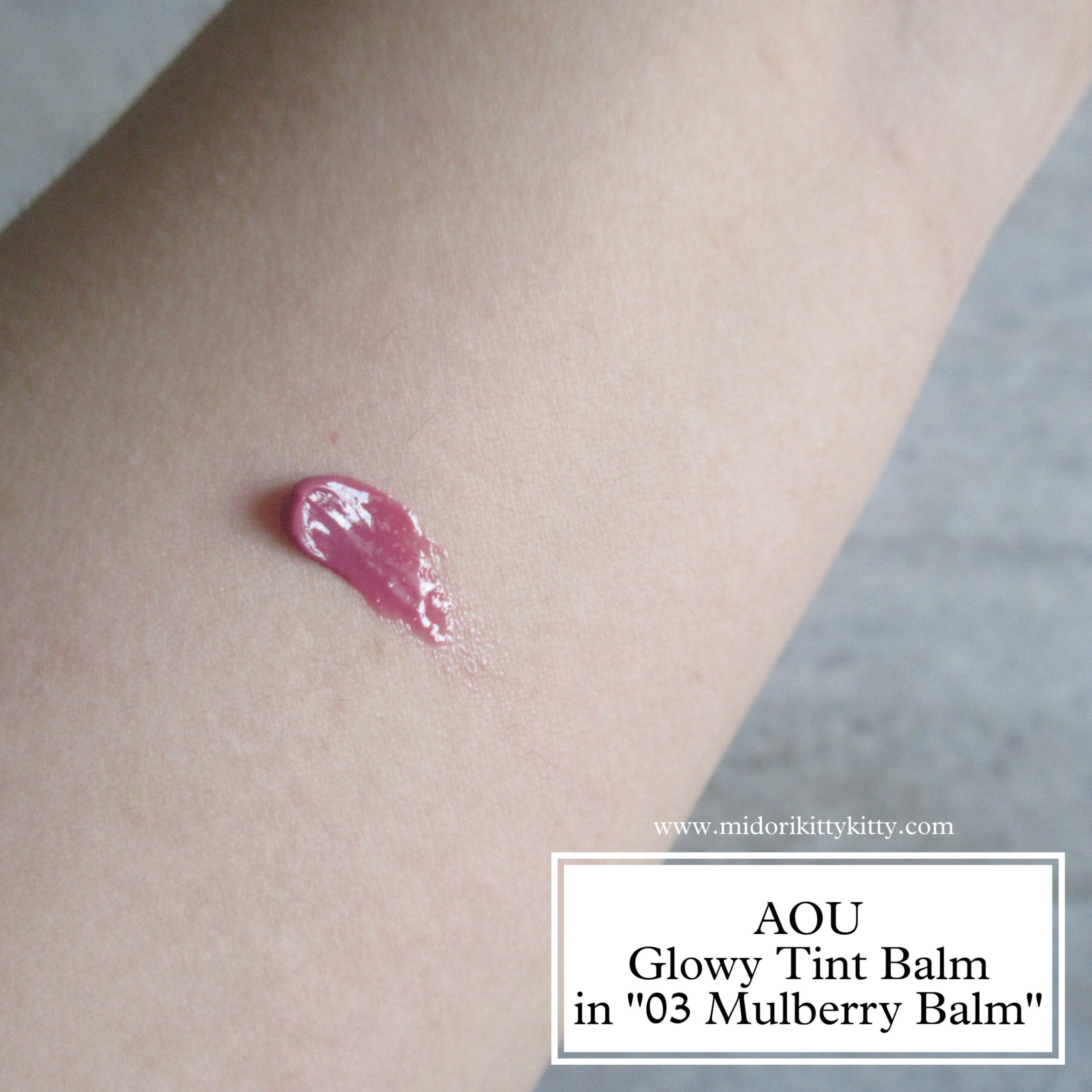 - ‘03 Mulberry Balm’ – a sheer pinkish plum. The brand calls it “a mauve halfway between pink and plum” but I do not think it’s mauve in the slightest.