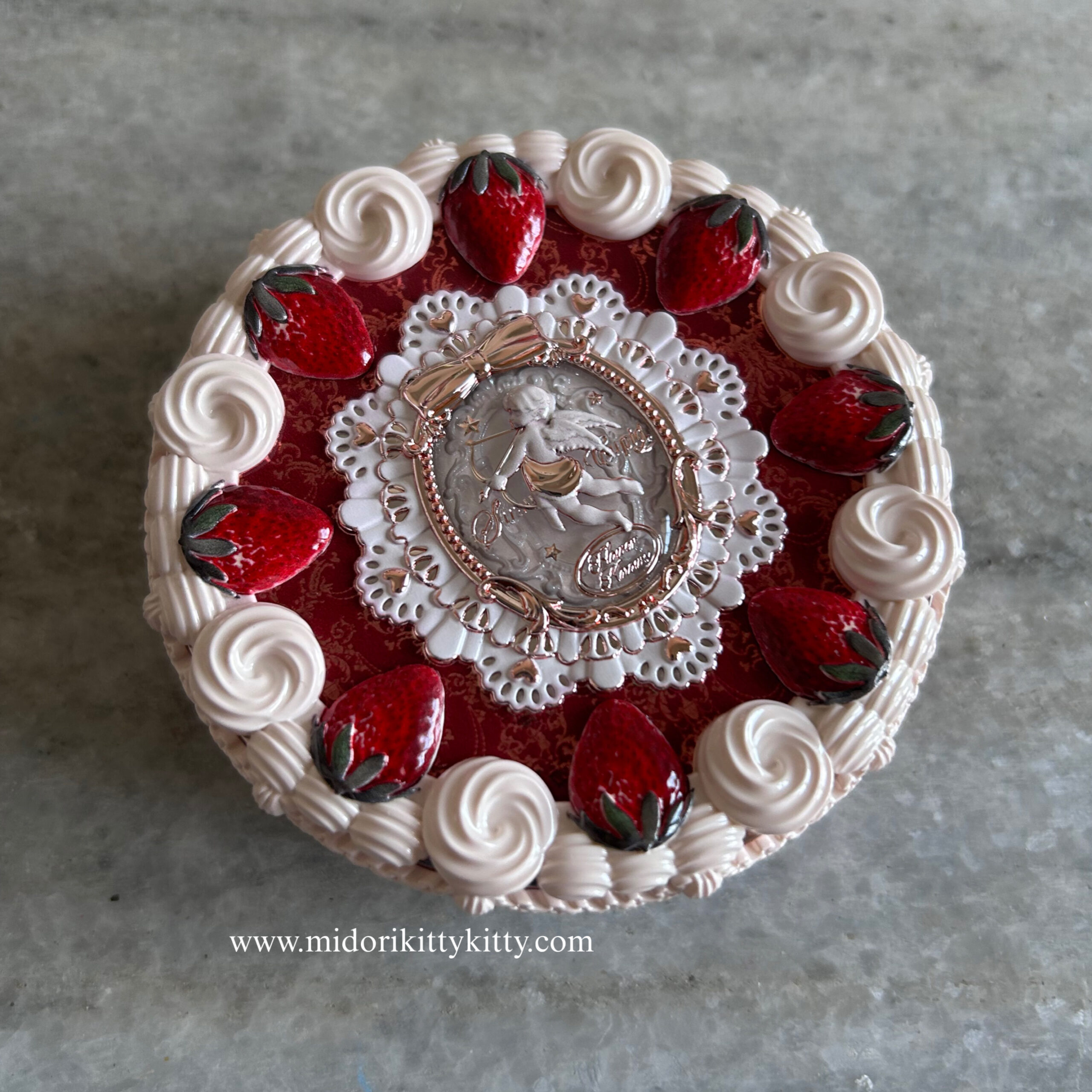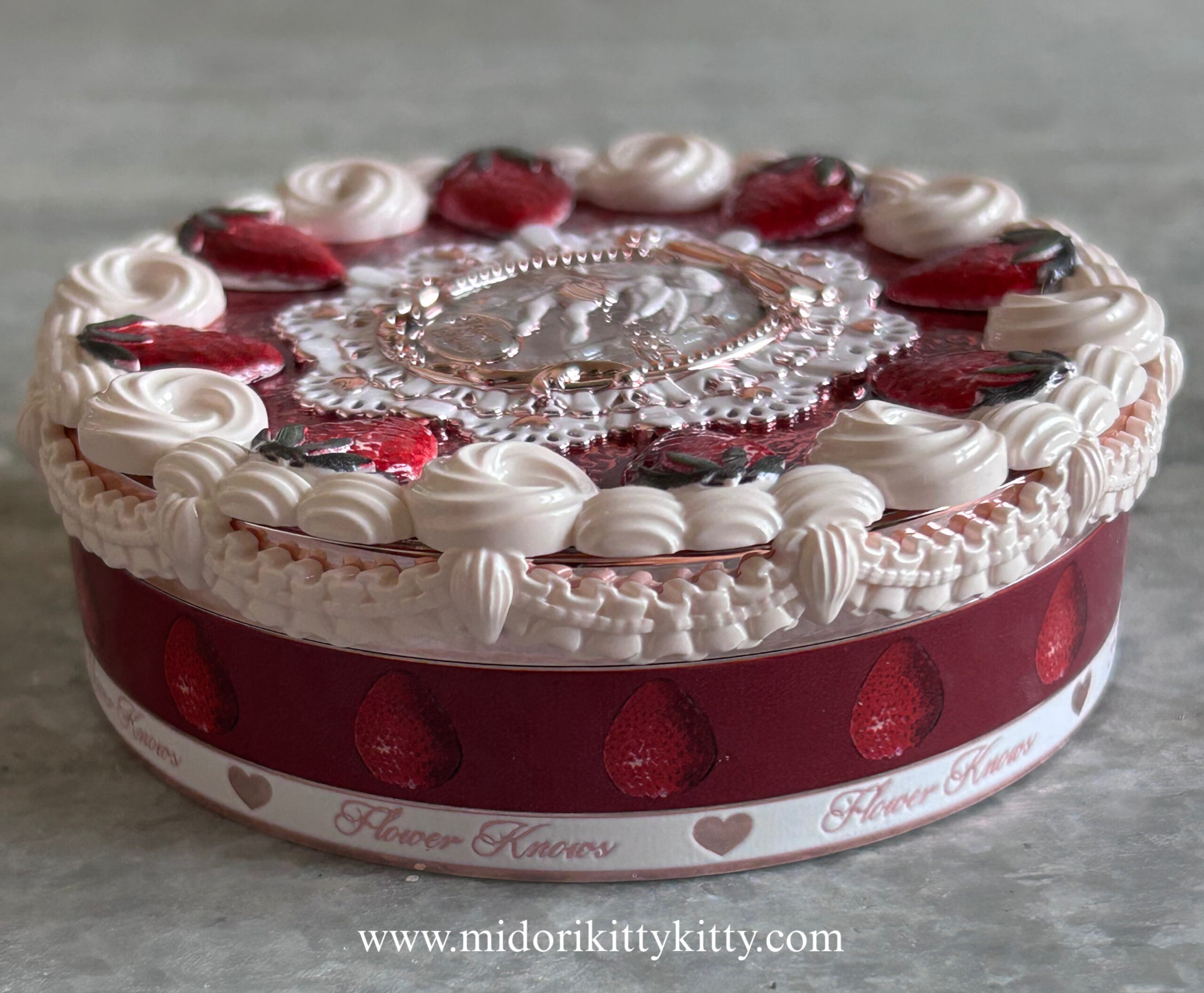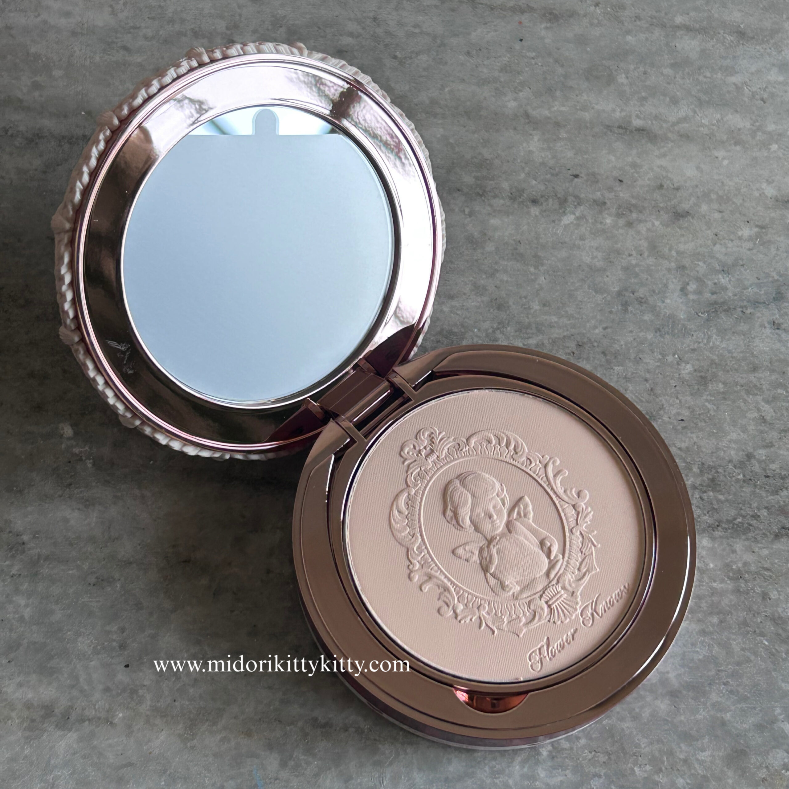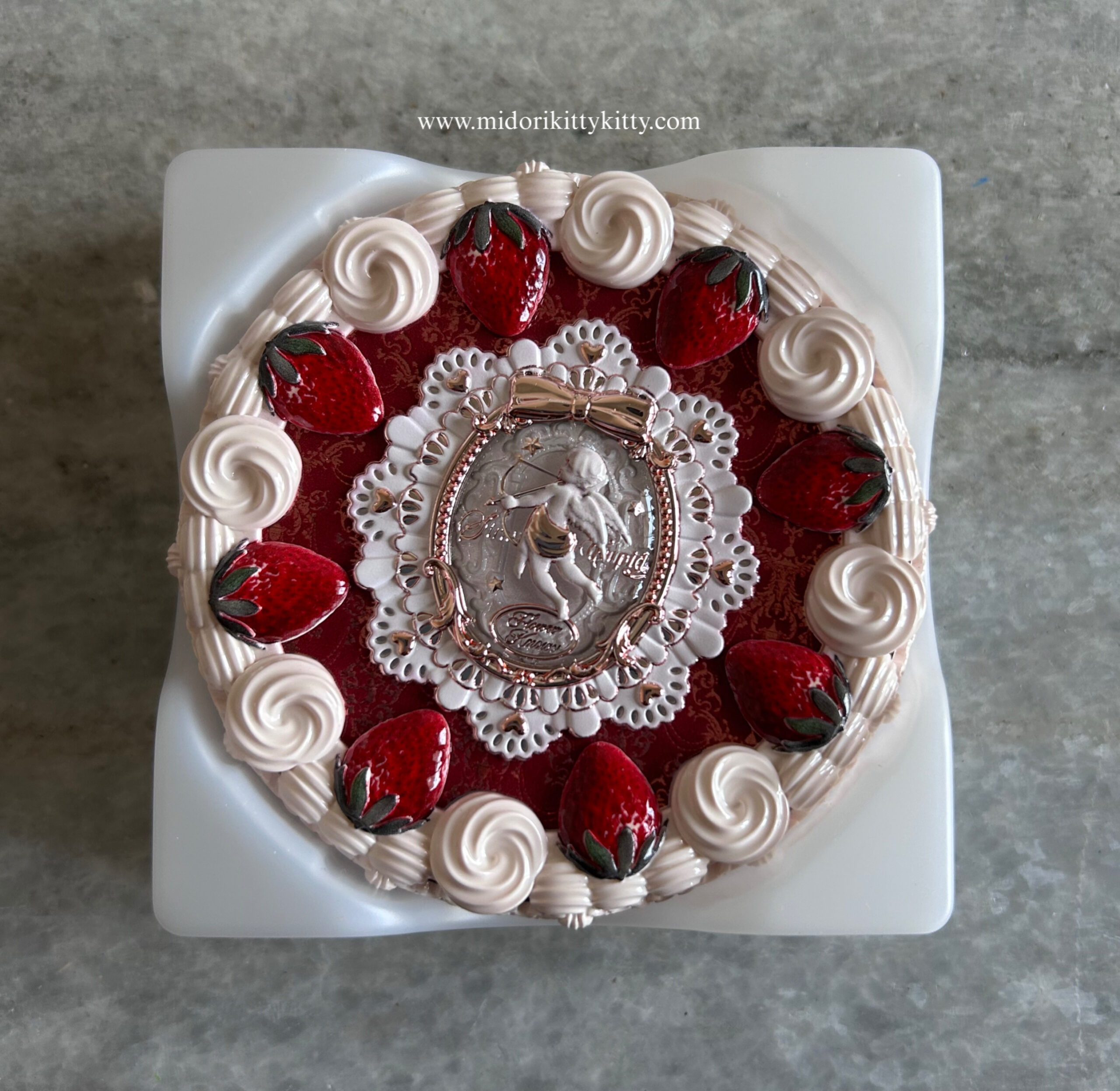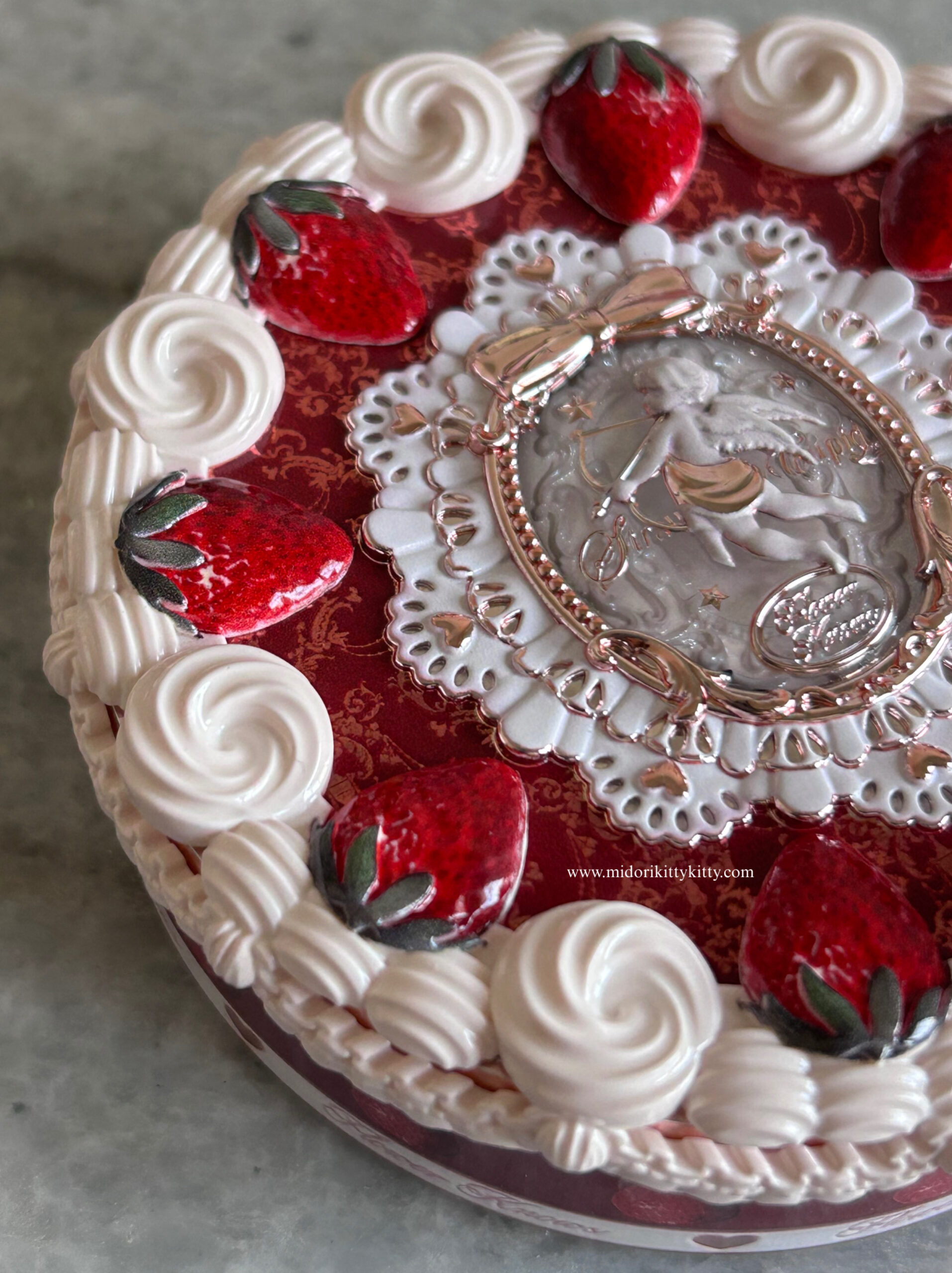 I love the little strawberries on top of the compact as well as the little dollops of cream which make it look like a delicious cookie, waiting to be scarfed down. I also like the little cupid embossed onto the powder itself. If you lift up the pressed powder’s pan, you get a divot that stores a puff for application. The mirror housed in the compact is also of good quality.