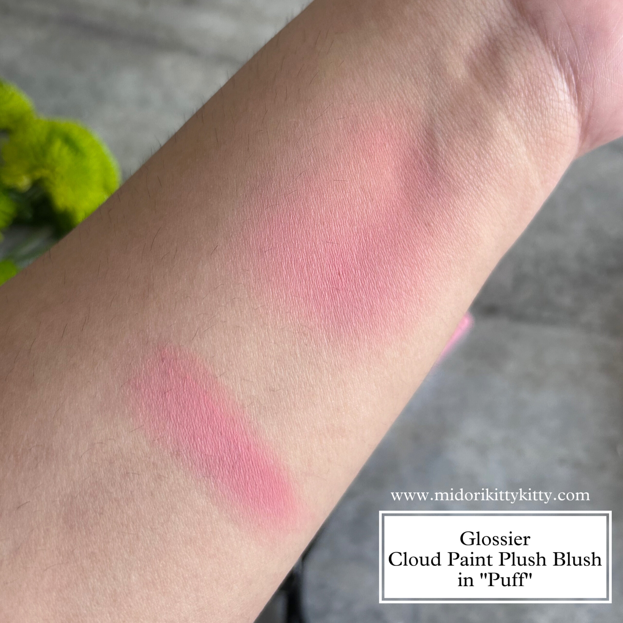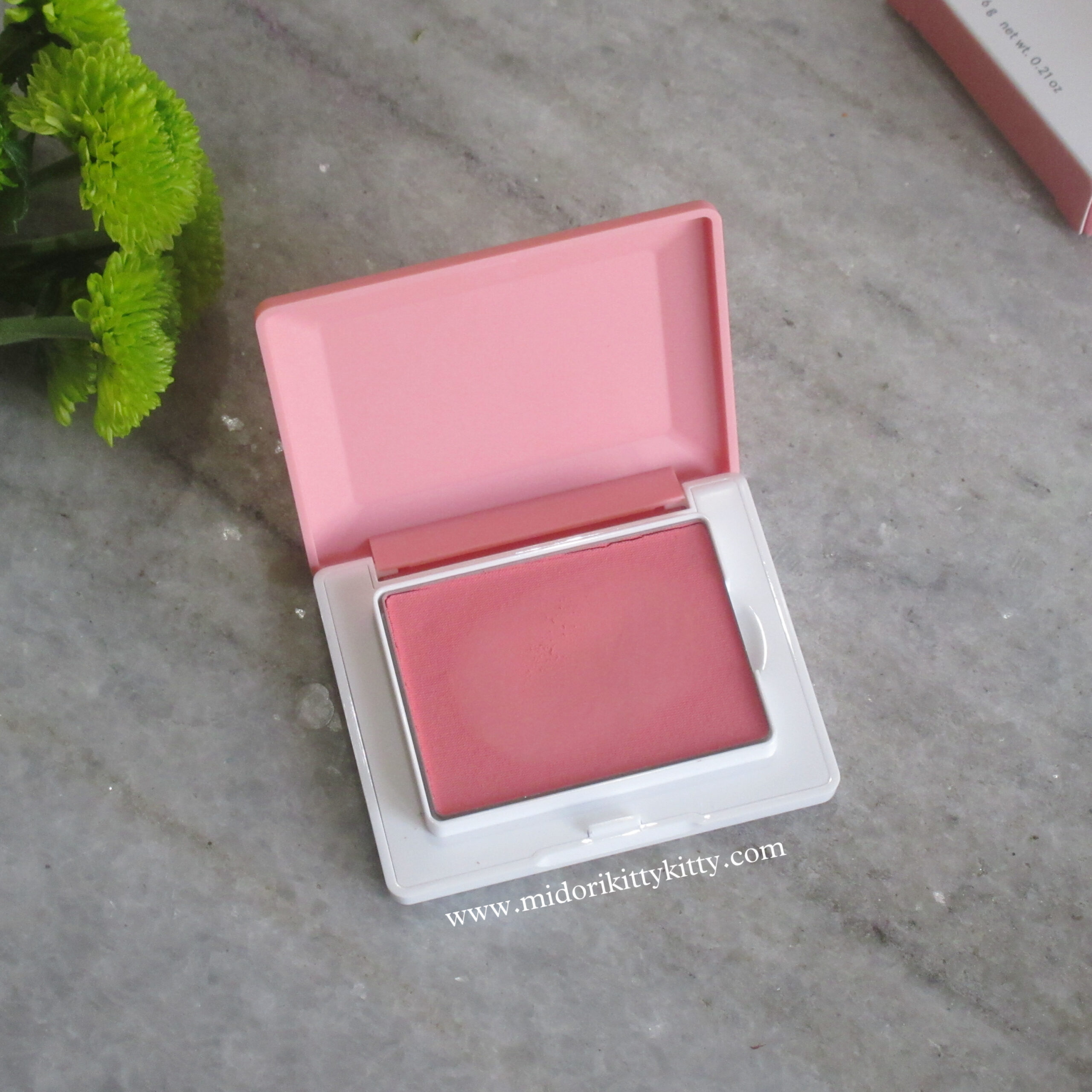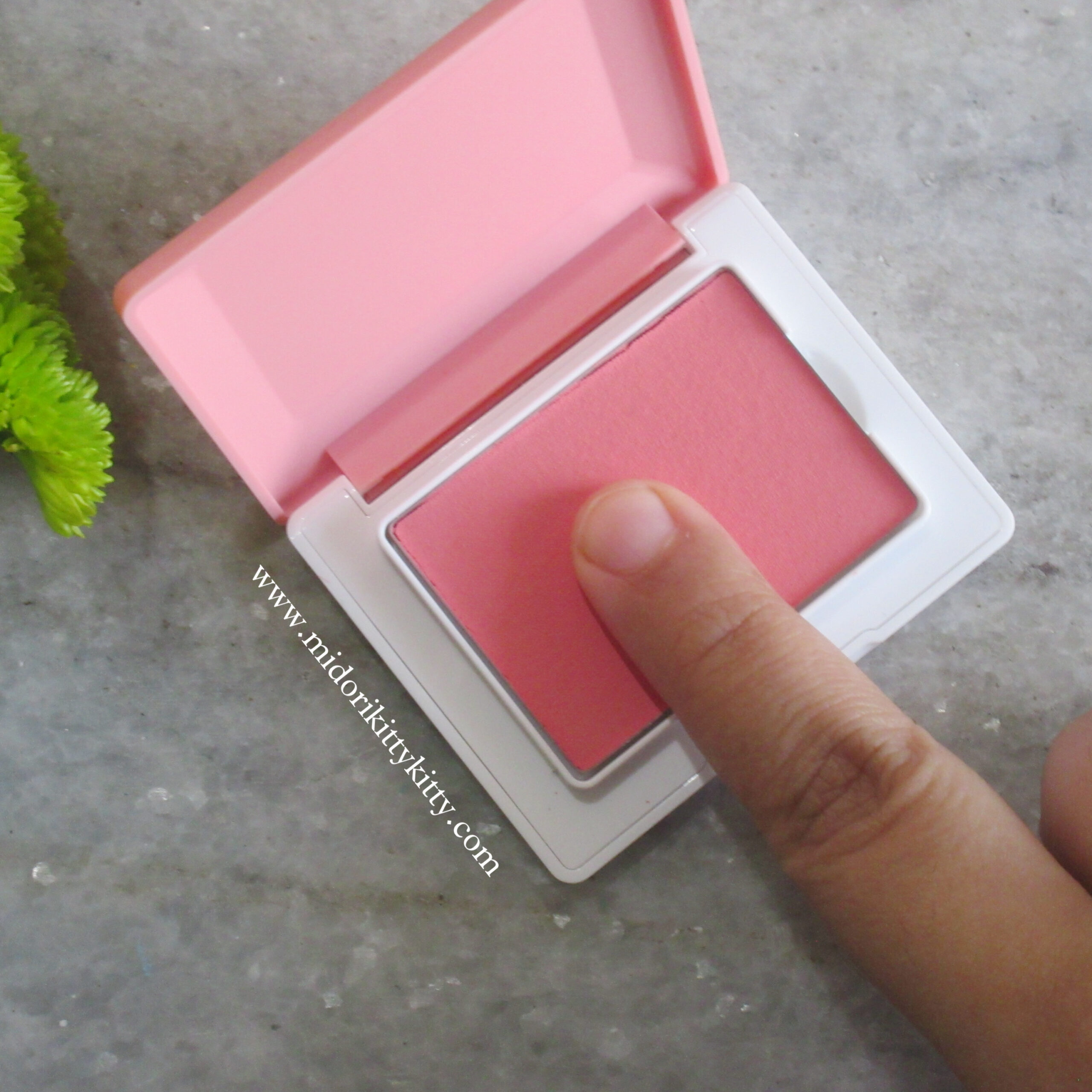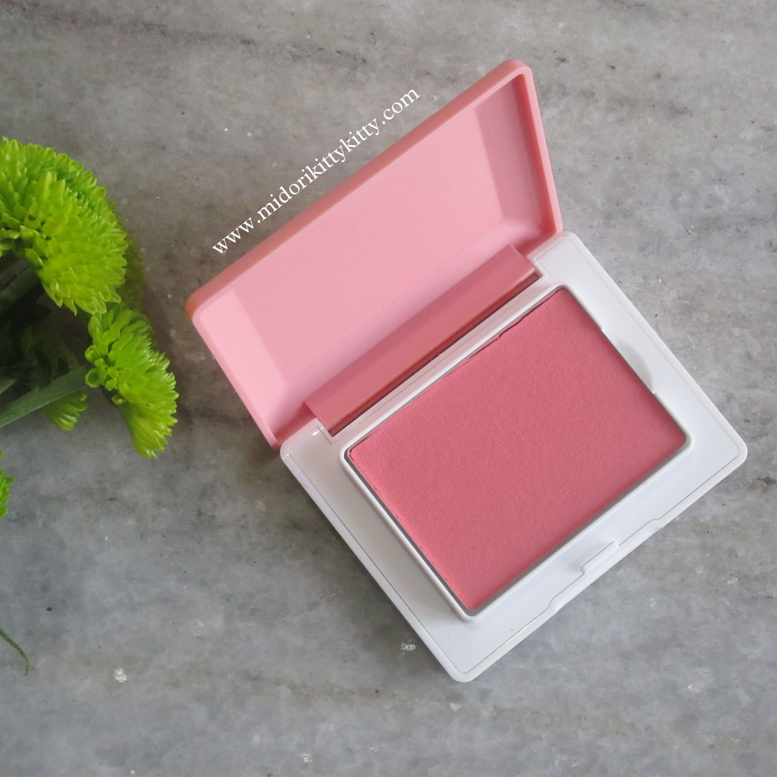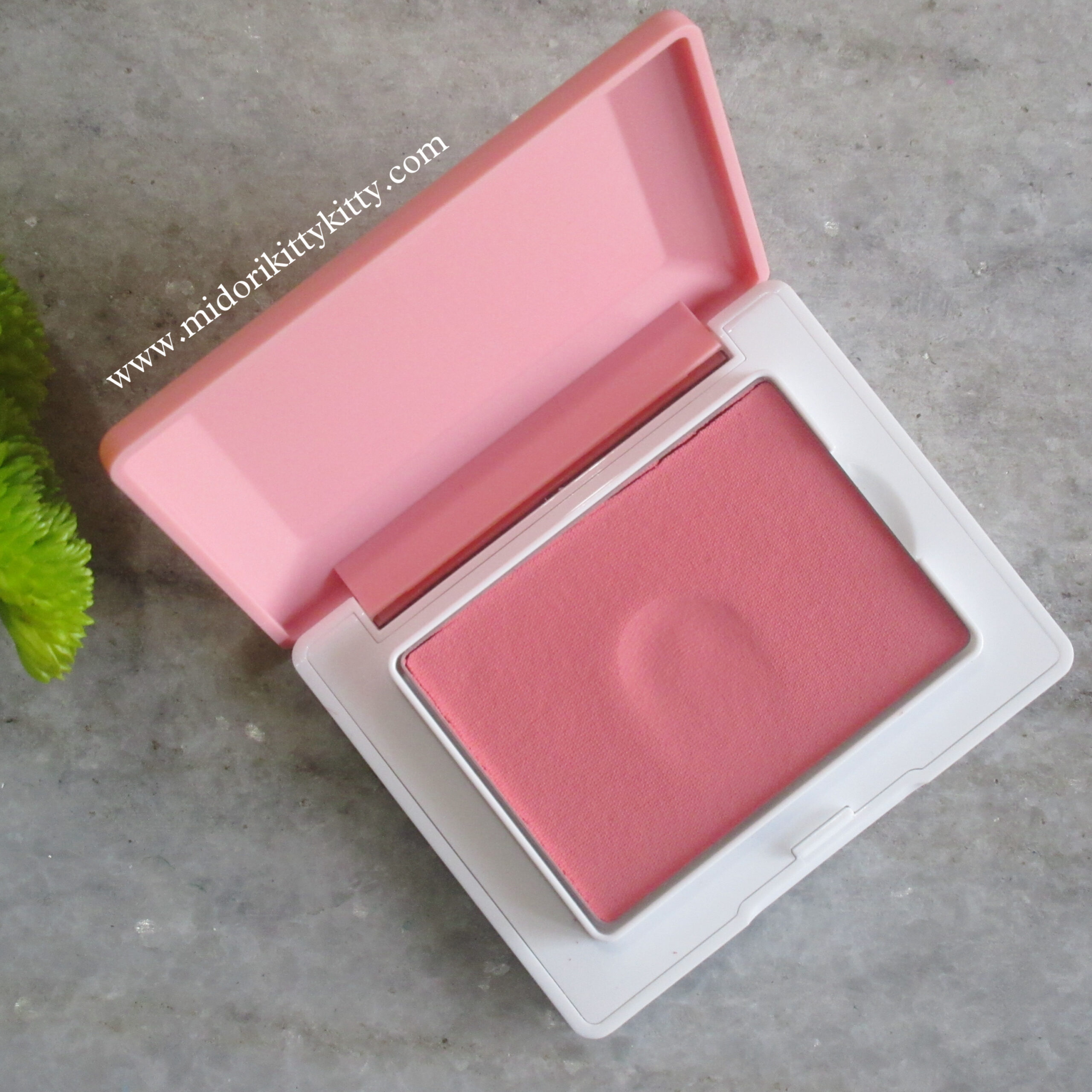 The blush has a putty texture and is a cream-to-powder formula. The brand calls the putty consistency a “memory cloud” texture. Any indentations your brush/finger leaves behind is going to stay.